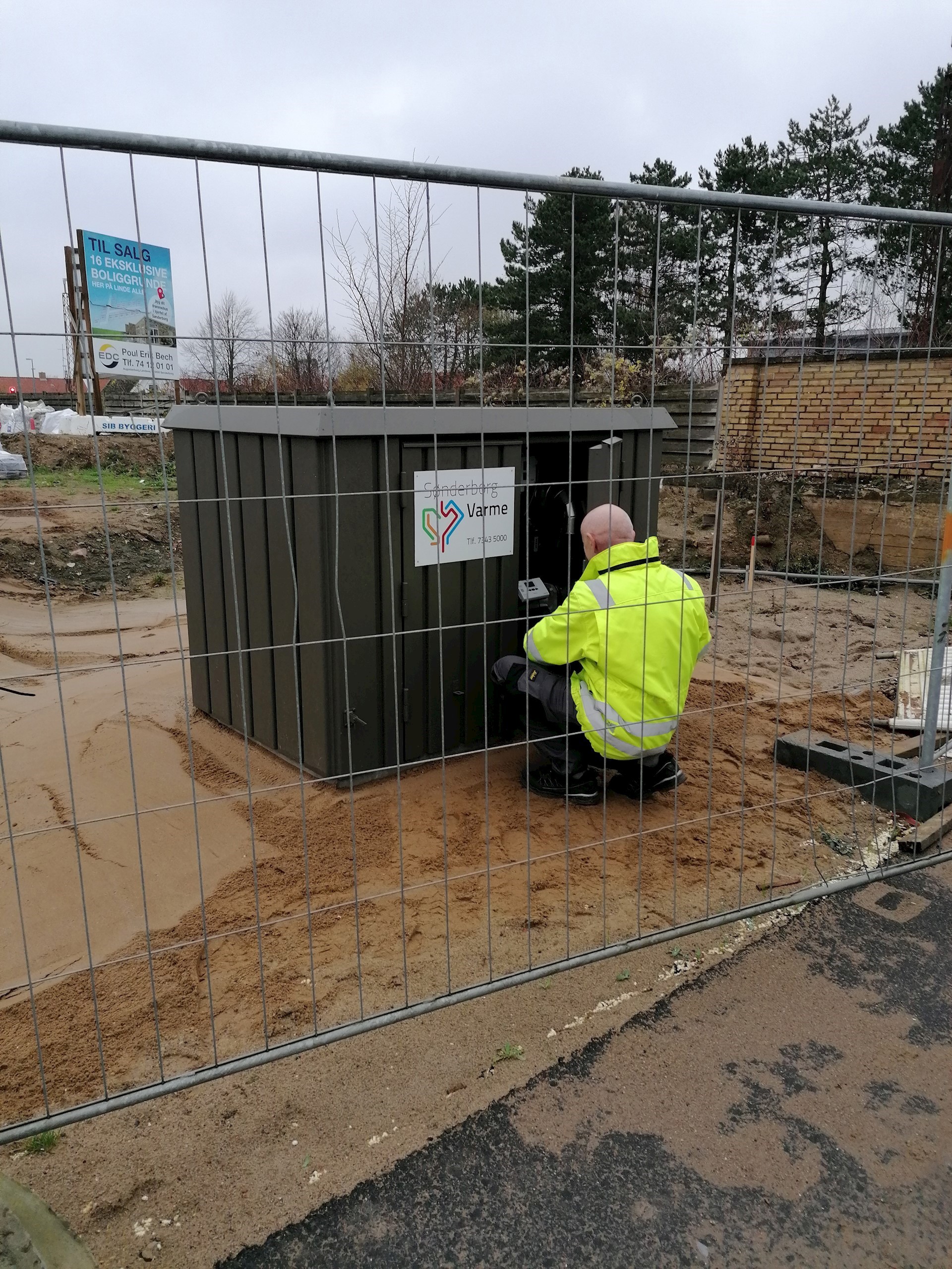 Påsætning af skilt på vores teknikhus for lavtemperatur-fjernvarme.