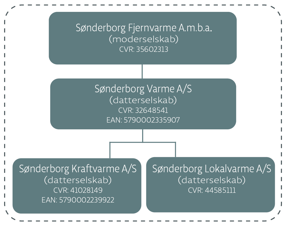 - Sønderborg Fjernvarme A.m.b.a. er det forbrugerejede selskab (moderselskabet). Sønderborg Fjernvarme A.m.b.a. ejer aktierne i Sønderborg Varme A/S, som igen ejer alle aktier i Sønderborg Kraftvarme A/S og Sønderborg Lokalvarme A/S.