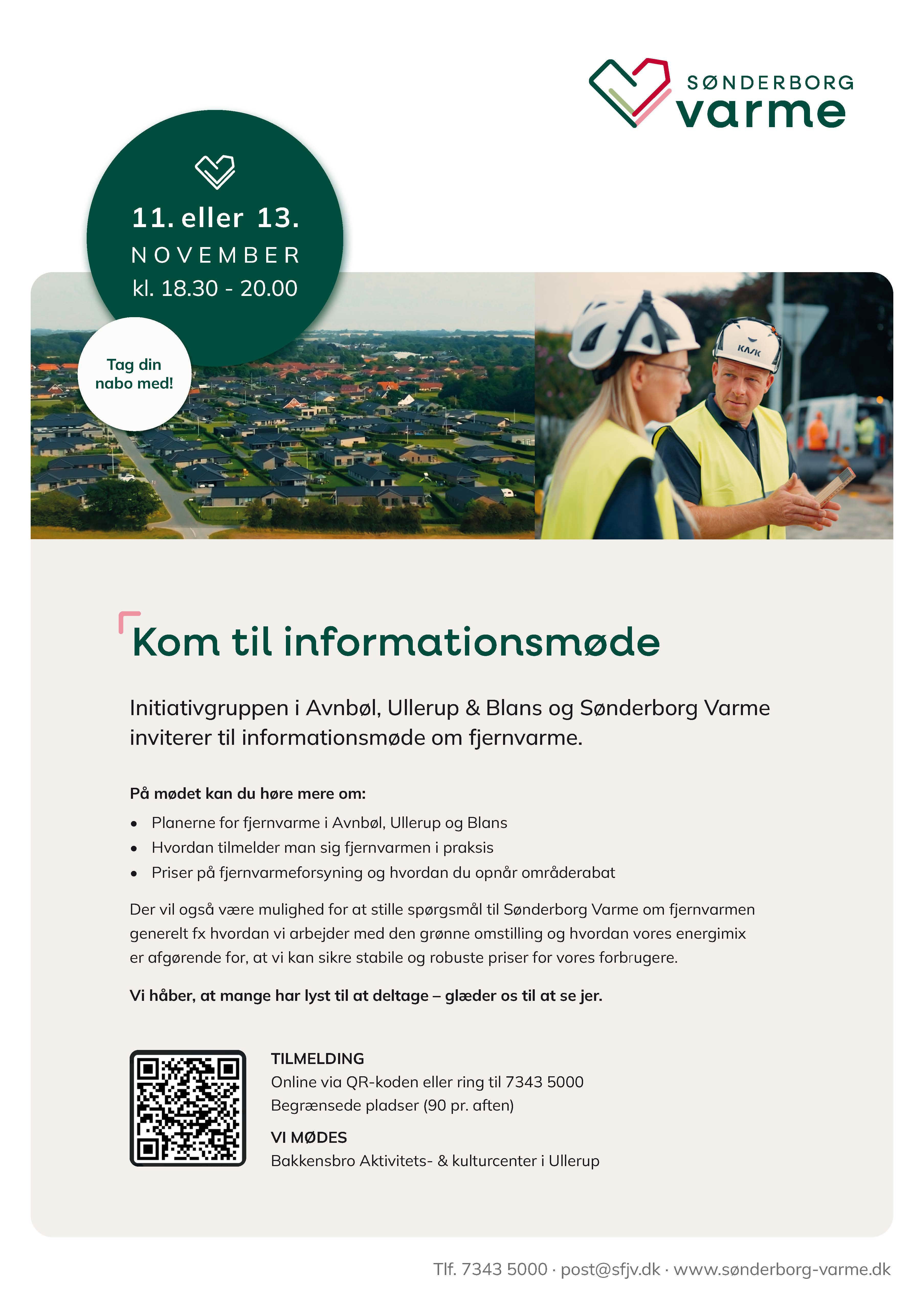Sammen med initiativgruppen i Avnbøl, Ullerup og Blans inviterer vi til informationsmøde om fjernvarme mandag den 25. november 2025 kl. 17:00-18:30 i Ullerup Kirke.